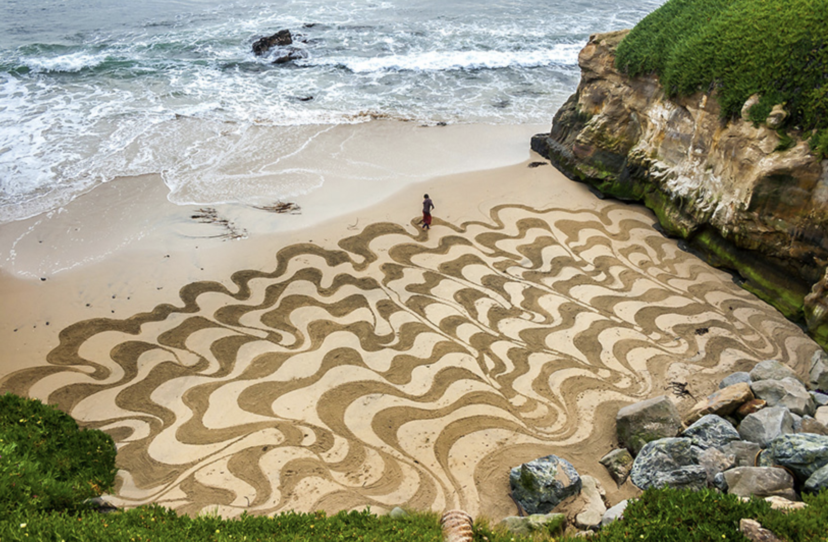 Когда смотришь, как ветер стирает песчаную линию, понимаешь: исчезновение - тоже форма присутствия. Замечательный пример: американский художник Андрес Амадор (Andres Amador) работает с песком с 2004 года. Андрес работает с ним как с холстом, на котором каждое произведение обречено исчезнуть. Его гигантские геометрические рисунки "земляные картины" рождаются на пляжах Калифорнии, когда прилив отступает и открывает ровную влажную поверхность. Вместо кисти - грабли, вместо краски - свет и тень, ложащиеся на рельеф песка. Работая в соавторстве с природой, Амадор создает масштабные композиции, которые живут несколько часов, пока не вернётся море.