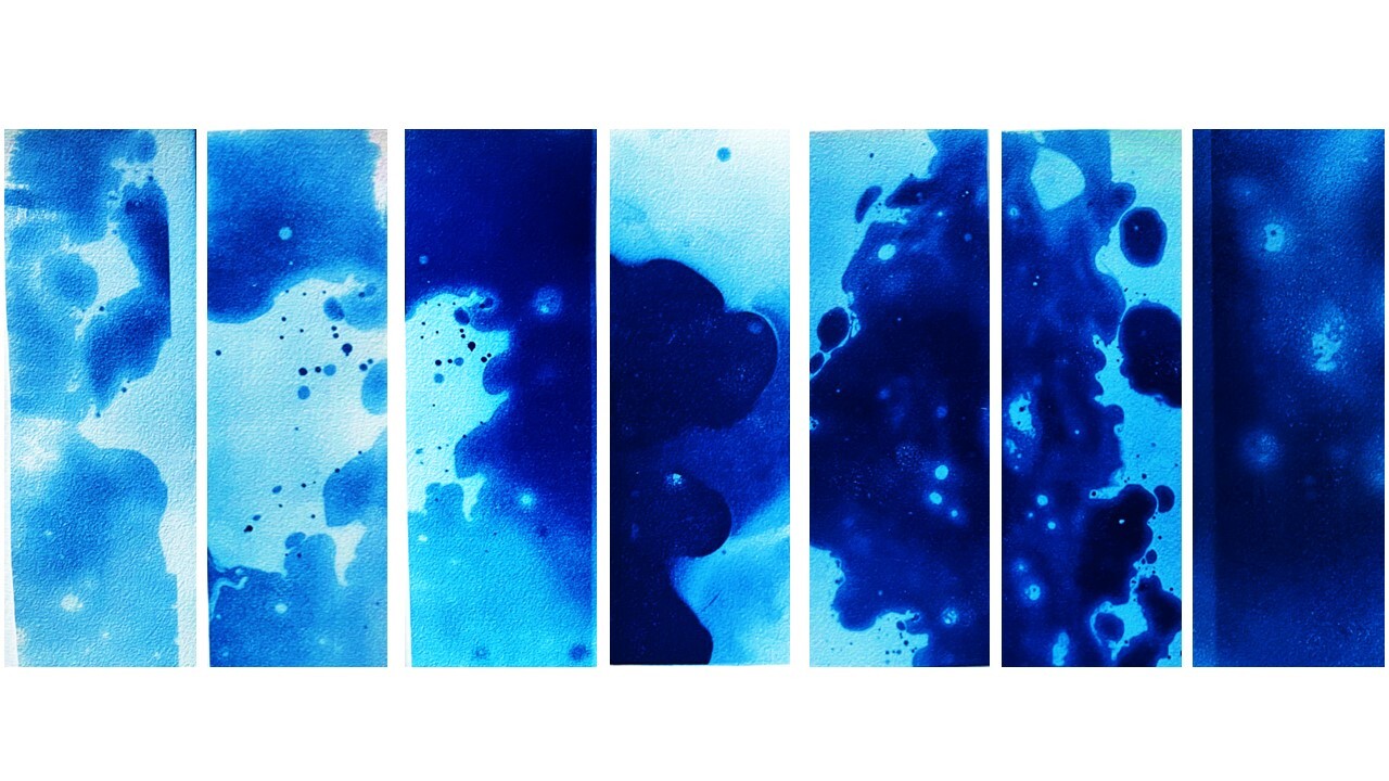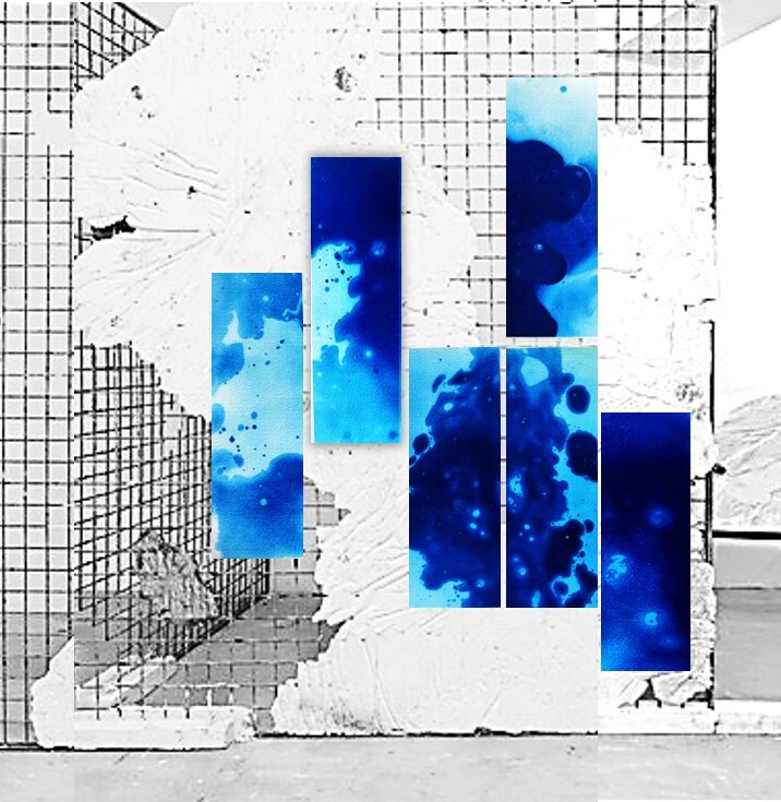 В проекте “Спасти море” я говорю о технологиях, которые выступают агентами в экологической катастрофе – разливе мазута в Черном море в 2024 году, тем самым привлекая внимание общественности к изменению отношения к проблемам экологии и будущего воды, как самого драгоценного природного ресурса человечества. В проект входят несколько объектов, в одном из которых меня привлекают образы нефтяных пятен на поверхности воды, для выражения которых я использую цианотипию на стекле. Материал позволяет передать эффект прозрачности и мутности поверхности, а также пропуская свет создавать тени и отражения на стенах, имитирующие поверхность воды и показывающие масштаб катастрофы. Проект планируется дополнить другими инсталляциями. Предлагается вариант экспонирования на металлической сетке, которая используется не только для фиксации объектов, но и как ассоциация с сетями, которые применялись для удержания мазута на берегу. Каждый следующий фрагмент работы сделан на тон темнее как иллюстрация усугубления ситуации, связанной с возрастающим распространением мазута и новыми выбросами. Фрагменты на сетке, выполненные из фактурной пасты, также поддерживают эту идею. Инсталляция живет как живой организм, в начале экспонирования вывешивается один фрагмент, далее каждый новый день добавляется еще один фрагмент, еще и еще, таким образом, показывая как захватываются мазутом все новые территории и как меняется ситуация каждый день. Усилить масштаб катастрофы может освещение, стеклянная поверхность пропускает свет от прожекторов, создавая отражения на стенах, имитирующие поверхность воды. Формат фрагментов 30х70 или 20х50 см, метод цианотипия на стекле.