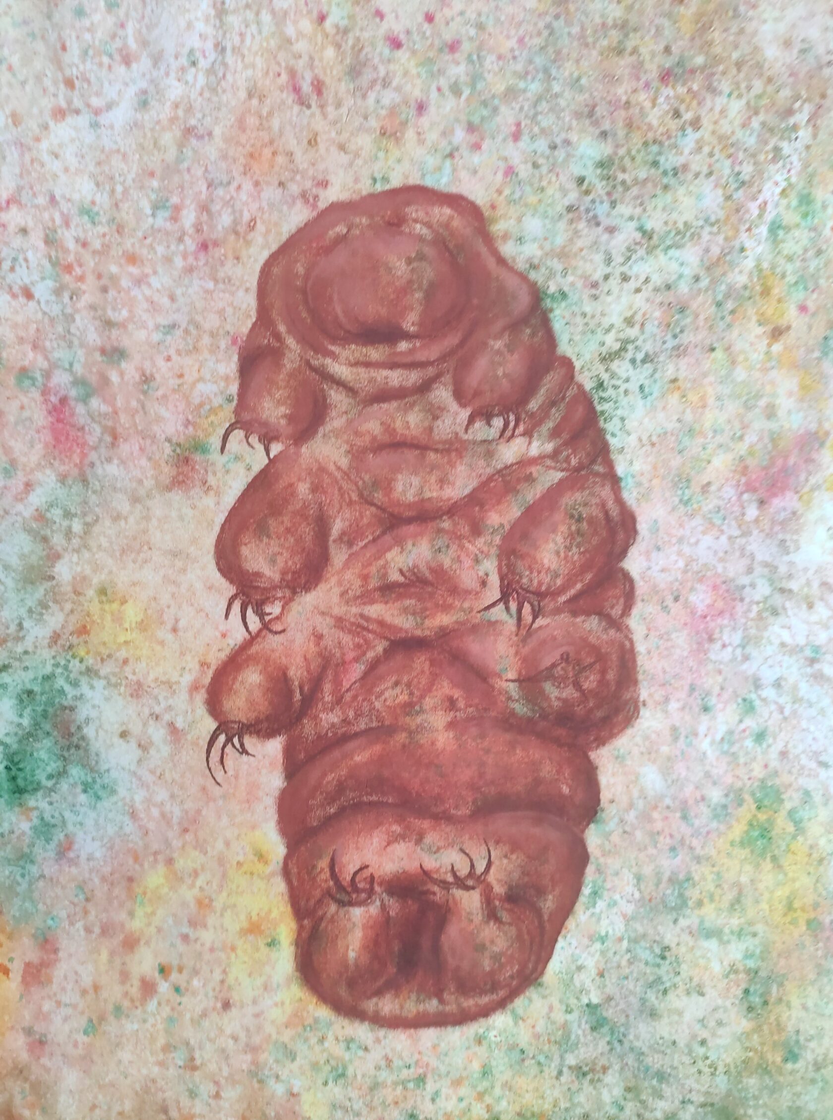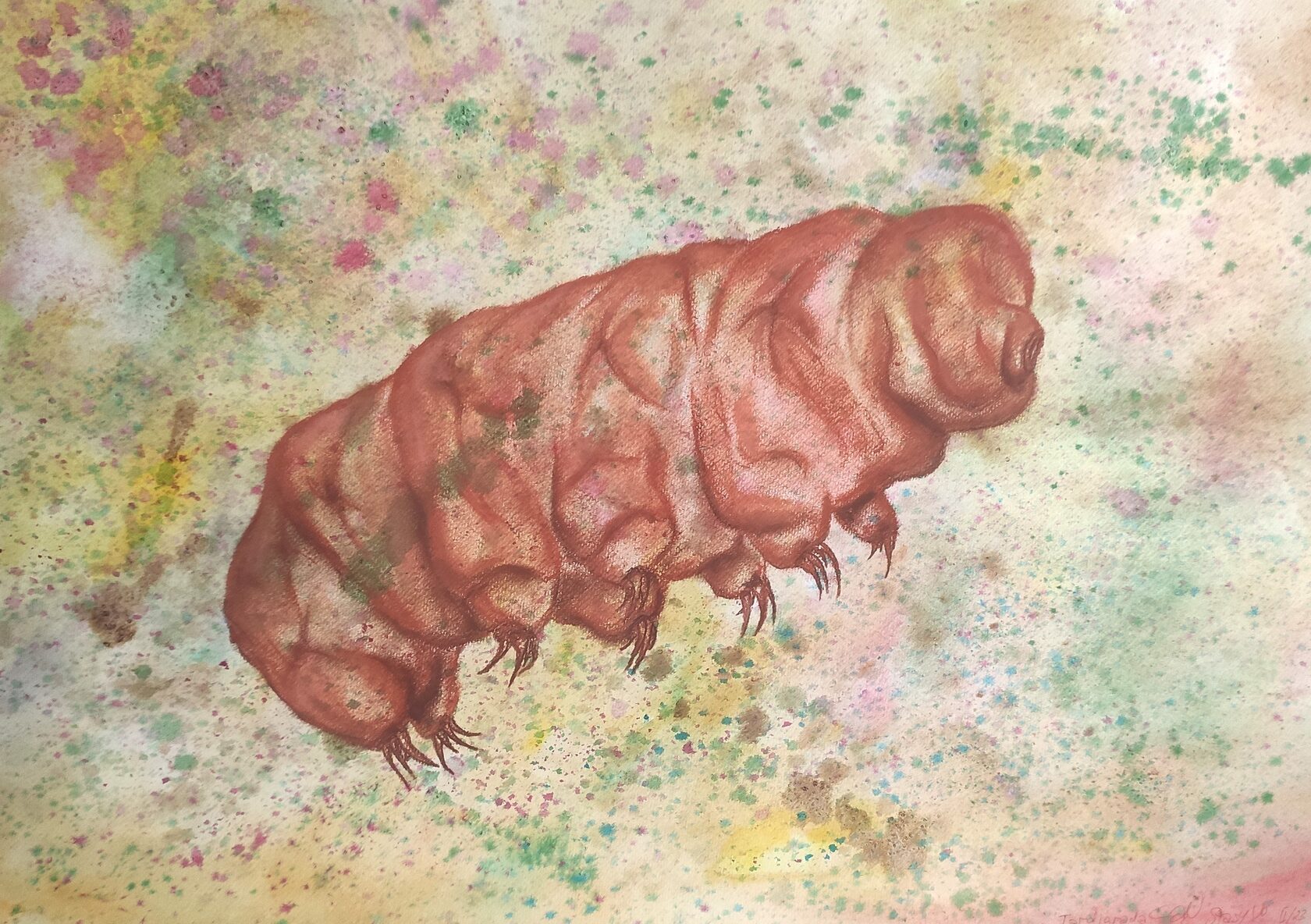 Тихоходки - одни из самых устойчивых животных на Земле. При этом они часть микромира, который обычно остаётся невидимым для нас, хотя именно в нём скрыты механизмы выживания, устойчивости и адаптации. Изображённая тихоходка - метафора тех форм жизни, которые выдерживают экстремальные условия и продолжают существовать несмотря ни на что. Через этот образ предлагаю взглянуть на экологическую повестку под другим углом: под углом веры в природные механизмы, и в то, что нам кажется незначительным или невидимым, может оказаться ключевым для понимания будущего устойчивости.