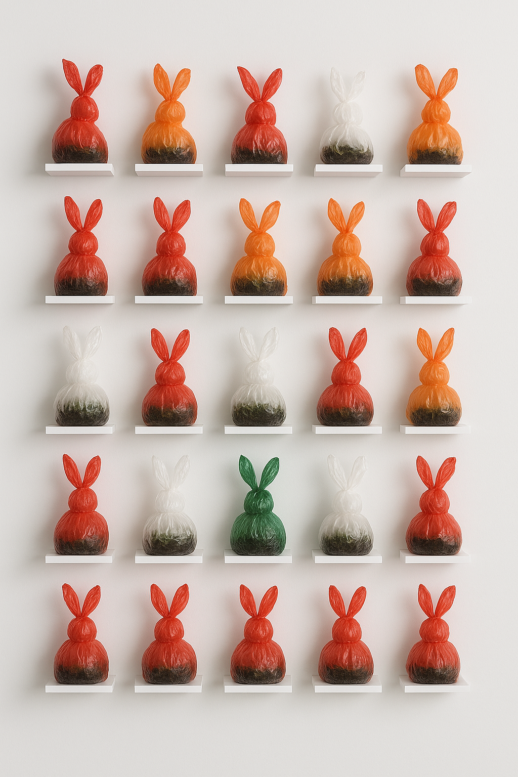 77 фигур зайцев сделаны из полиэтиленовых пакетов. Внутри каждого — земля, трава и мусор: остатки живого перемешаны с неживым и заключены в оболочку отходов. Со временем трава внутри пакетов увядает, превращаясь в тусклое напоминание о жизни, запертой в пластике. Эти пластиковые животные словно замещают настоящих, становясь символами новой экологии — постживой, созданной из того, что не разлагается. Рядом с некоторыми зайцами размещены наклейки с координатами и QR-кодами, ведущими к фотографиям конкретных мест в Подмосковье, где лес был вытеснен мусором. У других таких меток нет — не все точки загрязнения найдены. Так формируется «заячья территория» — карта, на которой природа уже частично заменена искусственным. Проект — ироничный и тревожный комментарий о нашем «аппетите» к потреблению, который превращает землю в полимерный ландшафт.