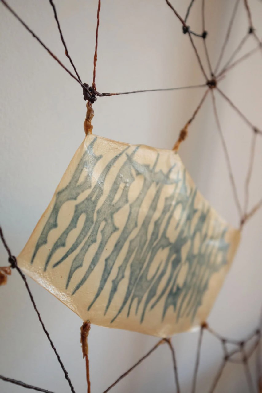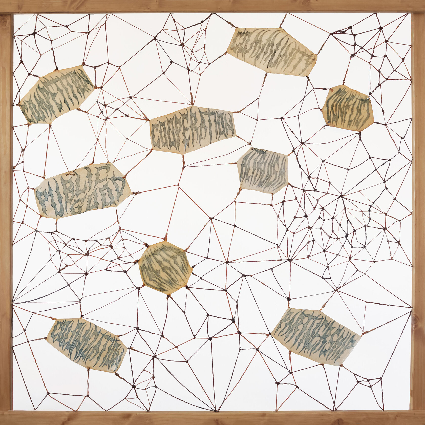 100х100 см Сеть из скрученных шнуров SCOBY-кожи - высушенной целлюлозной биоплёнки комбучи. В неё вплетены фрагменты татуированной кожи. Сюжеты татуировок - слова, собранные на пересечении терминов микробиологии и социальных наук. Сеть отсылает к структуре комбучи при увеличении и символизирует социальные связи микроорганизмов. Вплетение слов - символ схожести челеческого и микробного сообществ. Подробности проекта читайте по ссылке